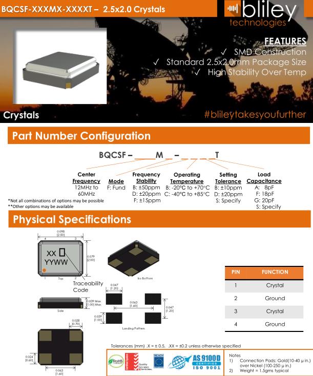 百利晶振,BQCSF晶振,BQCSF-24.000M-FDCBFT晶振,小型貼片石英晶振,外觀尺寸具有薄型表面貼片型石英晶體振蕩器,特別適用于有小型化要求的市場領域,比如智能手機,無線藍牙,平板電腦等電子數碼產品.晶振本身超小型,薄型,重量輕,晶體具有優良的耐環境特性,如耐熱性,耐沖擊性,在辦公自動化,家電相關電器領域及Bluetooth,WirelessLAN等短距離無線通信領域可發揮優良的電氣特性,滿足無鉛焊接的回流溫度曲線要求.Bliley Technologies Inc. 最初于 1930 年作為 Bliley Piezo-Electric Company 成立。最初,我們為業余無線電市場制造石英晶體。在 1930 年代中期,我們的客戶和產品很快擴大到與新興的軍事和商業通信領域的利益相匹配,我們的名稱更名為 Bliley Electric Company。1939 年,我們是最大的水晶公司,擁有 11 名員工。