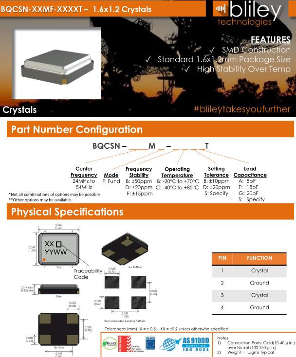 Bliley晶振,BQCSN晶振,BQCSN-24.000M-FFCDST晶振,貼片晶振本身體積小,超薄型石英晶體振蕩器,特別適用于有目前高速發展的高端電子數碼產品,因為晶振本身小型化需求的市場領域,小型,薄型是對應陶瓷振蕩器(偏差大)和普通的石英晶體振蕩器(偏差小)的中間領域的一種性價比較出色的產品.產品廣泛用于筆記本電腦,無線電話,衛星導航SSD,USB,Blu-ray等用途,符合無鉛焊接的高溫回流焊曲線特性.Bliley Technologies Inc. 最初于 1930 年作為 Bliley Piezo-Electric Company 成立。最初,我們為業余無線電市場制造石英晶體。在 1930 年代中期,我們的客戶和產品很快擴大到與新興的軍事和商業通信領域的利益相匹配,我們的名稱更名為 Bliley Electric Company。1939 年,我們是最大的水晶公司,擁有 11 名員工。