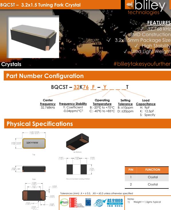 Bliley晶振,BQCST晶振,BQCST-32K76F-YCDHT晶振,32.768K時鐘晶體具有小型,薄型,輕型的貼片晶振表面音叉型晶體振蕩器,產品具有優良的耐熱性,耐環境特性,可發揮晶振優良的電氣特性,符合RoHS規定,滿足無鉛焊接的高溫回流溫度曲線要求,金屬外殼的封裝使得產品在封裝時能發揮比陶瓷振蕩器外殼更好的耐沖擊性.Bliley Technologies Inc. 最初于 1930 年作為 Bliley Piezo-Electric Company 成立。最初,我們為業余無線電市場制造石英晶體。在 1930 年代中期,我們的客戶和產品很快擴大到與新興的軍事和商業通信領域的利益相匹配,我們的名稱更名為 Bliley Electric Company。1939 年,我們是最大的水晶公司,擁有 11 名員工。