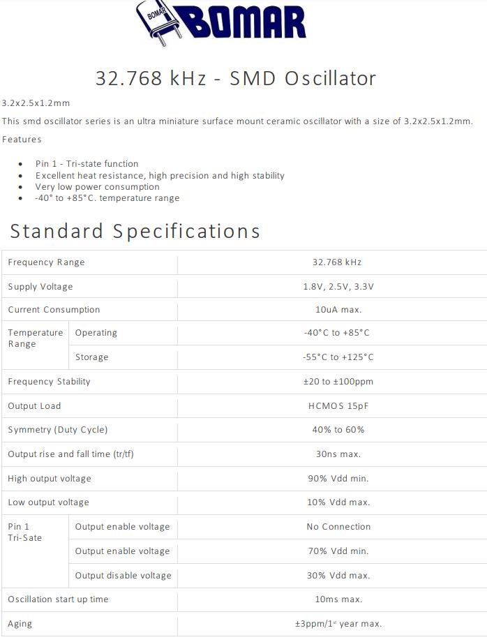 Bomar晶振,B1350-AEBS3T-32.768kHz晶振,高品質(zhì)晶振,小型SMD有源晶振,從最初超大體積到現(xiàn)在的7050mm,6035mm,5032mm,3225mm,2520mm體積,有著翻天覆地的改變,體積的變小也使產(chǎn)品帶來了更高的穩(wěn)定性能,接縫密封石英晶體振蕩器,精度高,覆蓋頻率范圍寬的特點(diǎn),SMD高速自動(dòng)安裝和高溫回流焊設(shè)計(jì),Optionable待機(jī)輸出三態(tài)輸出功能,電源電壓范圍:1.8V~5V,高穩(wěn)定性,低抖動(dòng),低功耗,主要應(yīng)用領(lǐng)域:無線通訊,高端智能手機(jī),平板筆記本W(wǎng)LAN,藍(lán)牙,數(shù)碼相機(jī),DSL和其他IT產(chǎn)品的晶振應(yīng)用,三態(tài)功能,PC和LCDM等高端數(shù)碼領(lǐng)域,符合RoHS/無鉛.Bomar成立于 1963 年,是一家為商業(yè)和雙向無線電行業(yè)生產(chǎn)石英晶體的制造商。該業(yè)務(wù)的性質(zhì)要求在寬頻率范圍內(nèi)具有嚴(yán)格的容差和高穩(wěn)定性晶體,以滿足嚴(yán)格的 FCC 規(guī)范。快速生產(chǎn)的需求對我們不斷增長的客戶群很重要。我們的許多客戶都是當(dāng)?shù)亍⒅莺吐?lián)邦警察和監(jiān)視機(jī)構(gòu)。Bomar 很快不僅成為該市場的領(lǐng)先供應(yīng)商,而且因其產(chǎn)品質(zhì)量、快速周轉(zhuǎn)時(shí)間和無與倫比的客戶服務(wù)而獲得一致認(rèn)可。