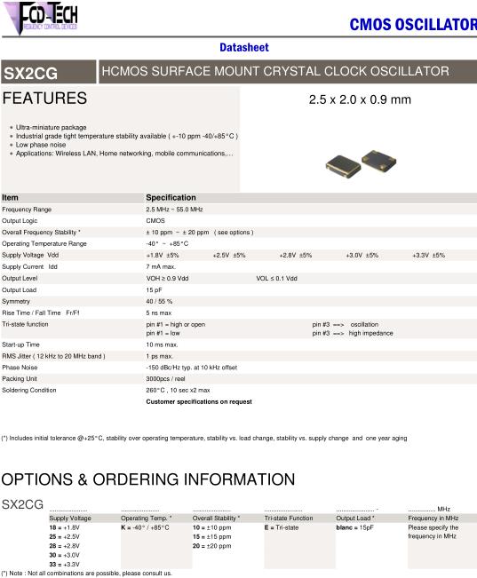 FCD-Tech晶振,SX2CG晶振,SX2CG-30K15E15pF-26.000MHz晶振,有源晶振,是指晶體本身起振需要外部電壓供應,起振后可直接驅動CMOS集成電路,產品本身已實現與薄型IC(TSSOP封裝,TVSOP封裝)同樣的1mm厚度,斷開時的消費電流是15µA以下,編帶包裝方式可對應自動搭載及IR回流焊接(無鉛對應)產品有幾種電壓供選1.8V,2.5V,3V3.3V,5V,以應對不同IC產品需要.