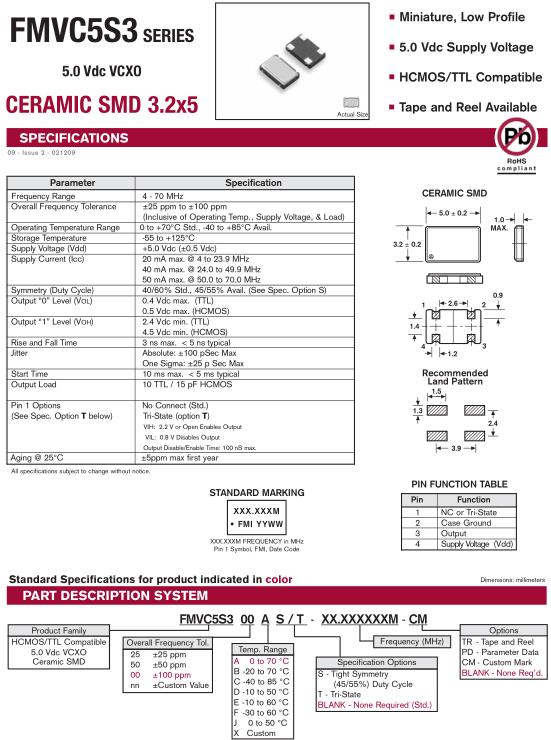 FMI晶振,FMVC5S3晶振,FMVC5S300AS/T-16.000M-CM晶振,壓控晶振(VCXO),壓控石英晶體振蕩器基本解決方案,PECL輸出,輸出頻率60MHz到200MHz之間,出色的低相位噪聲和抖動,三態功能,應用:SDH/SONET,以太網,基站,筆記本晶振應用,符合RoHS/無鉛.高可靠性-極端溫度晶體,振蕩器和傳感器,適用于極端環境條件,包括高沖擊和振動,極端溫度和高壓.我們的晶體振蕩器產品提供標準和定制表面貼裝(SMT,SMD)和通孔封裝.
