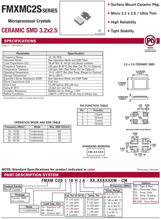 FMI晶振,FMXMC2S晶振,FMXMC2S118HJA-12.000M-CM晶振,超小型表面貼片型SMD晶振,最適合使用在汽車電子領(lǐng)域中,也是特別要求高可靠性的引擎控制用CPU的時(shí)鐘部分.低頻晶振可從7.98MHz起對(duì)應(yīng),小型,超薄型具備強(qiáng)防焊裂性,石英晶體在極端嚴(yán)酷的環(huán)境條件下也能發(fā)揮穩(wěn)定的起振特性,產(chǎn)品本身具有耐熱,耐振,耐撞擊等優(yōu)良的耐環(huán)境特性,滿足無(wú)鉛焊接以及高溫回流溫度曲線要求,符合AEC-Q200標(biāo)準(zhǔn)..FMI晶振作為標(biāo)準(zhǔn)通信公司的專屬供應(yīng)商,我們成立于1971年,30多年來(lái),我們一直為通信市場(chǎng)提供快速交付和嚴(yán)格公差,石英晶體和晶體振蕩器.1992年,頻率管理已擴(kuò)展到OEM市場(chǎng). FMI,頻率管理國(guó)際,成立的目的是為各種行業(yè)的各種電子系統(tǒng)應(yīng)用提供頻率和時(shí)序控制的工程解決方案.FMI是一家真正以解決方案為導(dǎo)向的美國(guó)制造商.我們目前為各種細(xì)分市場(chǎng)提供產(chǎn)品,包括:極端環(huán)境,能源勘探,石油和天然氣勘探(各種定向鉆井工具),石油和天然氣生產(chǎn)工具,地?zé)?,熱監(jiān)測(cè)工具,空間,科學(xué)(低地球軌道),科學(xué)(深空),廣告,軍事和航空航天,航空電子學(xué),導(dǎo)航,控制系統(tǒng),商業(yè)和工業(yè),電信(有線或無(wú)線),無(wú)線(包括實(shí)用計(jì)量和大容量微型調(diào)制解調(diào)器,如XBee),工業(yè)控制(包括計(jì)量),汽車(發(fā)動(dòng)機(jī)傳感器等),電腦周邊設(shè)備,LAN/WAN,光網(wǎng)絡(luò).
