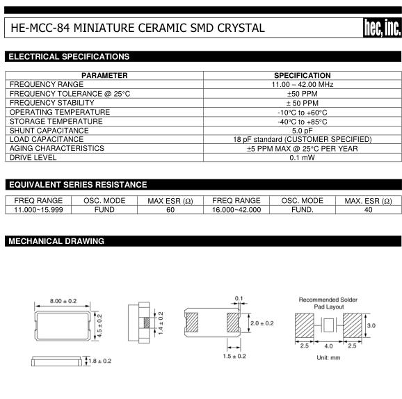 HEC晶振,HE-MCC-84晶振,HE-MCC-84-24.00-10晶振,貼片晶振本身體積小,超薄型石英晶體振蕩器,特別適用于有目前高速發展的高端電子數碼產品,因為晶振本身小型化需求的市場領域,小型,薄型是對應陶瓷振蕩器(偏差大)和普通的石英晶體振蕩器(偏差小)的中間領域的一種性價比較出色的產品.產品廣泛用于筆記本電腦,無線電話,衛星導航SSD,USB,Blu-ray等用途,符合無鉛焊接的高溫回流焊曲線特性.