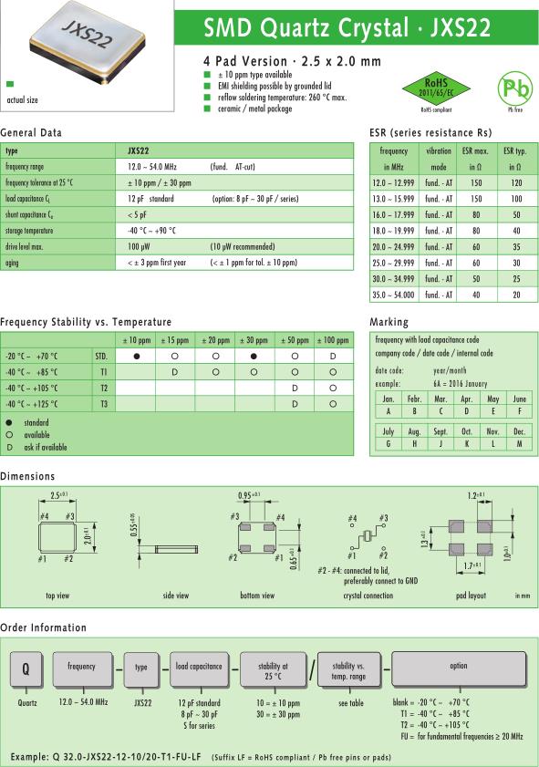 | Jauch晶振規格 | 單位 | JXS22晶振頻率范圍 | 石英晶振基本條件 |