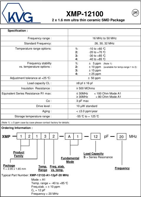 | KVG晶振規格 | 單位 | XMP-12100晶振頻率范圍 | 石英晶振基本條件 | |