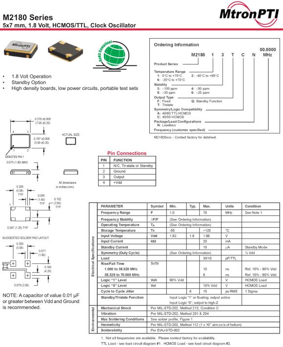 MtronPTI晶振,M2180晶振,M218013TCN26.000MHz晶振,小型SMD有源晶振,從最初超大體積到現在的7050mm,6035mm,5032mm,3225mm,2520mm體積,有著翻天覆地的改變,體積的變小也使產品帶來了更高的穩定性能,接縫密封石英晶體振蕩器,精度高,覆蓋頻率范圍寬的特點,SMD高速自動安裝和高溫回流焊設計,Optionable待機輸出三態輸出功能,電源電壓范圍:1.8V?5V,高穩定性,低抖動,低功耗,主要應用領域:無線通訊,高端智能手機,平板筆記本WLAN,藍牙,數碼相機,DSL和其他IT產品的晶振應用,三態功能,PC和LCDM等高端數碼領域,符合RoHS/無鉛.MtronPTI于1965年成立于雷達,為高可靠性/高性能應用設計和制造定制RF和微波解決方案。2004年成立,由M-tron Industries,Inc.收購Piezo Technology,Inc. MtronPTI是LGL Group,Inc.的全資子公司。