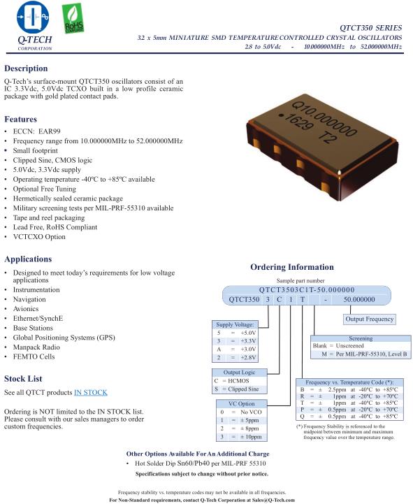 Q-Tech晶振,QTCT350晶振,QTCT3503C1T-20.000000晶振