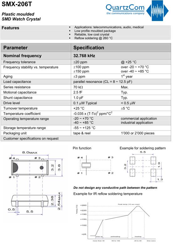 QuartzCom晶振,SMX-206T晶振,32.768K晶振,超小型,薄型,質地輕的表面貼片音叉型晶體振蕩器,手機晶體,產品體積小,特別適用于各種小巧的便攜式消費電子數碼產品,在移動通信領域得到了廣泛的應用,晶振產品本身可發揮優良的電氣特性,滿足無鉛焊接的高溫回流溫度曲線要求.