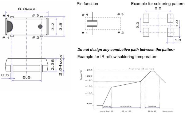 加熱包裝材料至+150°C以上會破壞產品特性或損害產品。如需在+150°C以上焊接晶體產品,建議使用SMD產品。在下列回流條件下,對晶體產品甚至SMD產品使用更高溫度,會破壞產品特性。建議使用下列配置情況的回流條件。安裝這些產品之前,應檢查焊接溫度和時間。同時,在安裝條件更改的情況下,請再次進行檢查。如果需要焊接的石英晶體產品在下列配置條件下進行焊接,請聯系我們以獲取耐熱的相關信息。