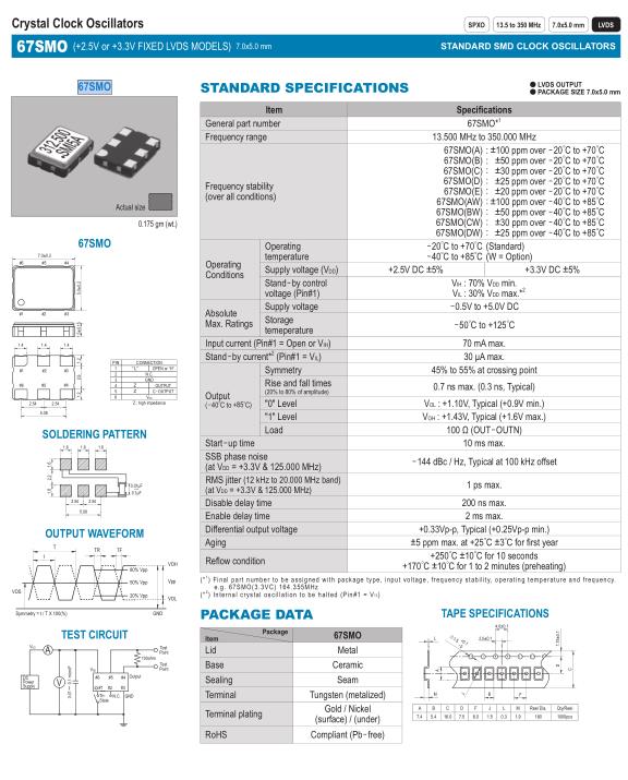 67SMO(A): ±100 ppm over -20゜C to +70゜C 67SMO(B): ±50 ppm over -20゜C to +70゜C 67SMO(C): ±30 ppm over -20゜C to +70゜C 67SMO(D): ±25 ppm over -20゜C to +70゜C 67SMO(E): ±20 ppm over -20゜C to +70゜C 67SMO(AW): ±100 ppm over -40゜C to +85゜C 67SMO(BW): ±50 ppm over -40゜C to +85゜C 67SMO(CW): ±30 ppm over -40゜C to +85゜C 67SMO(DW): ±25 ppm over -40゜C to +85゜C  |