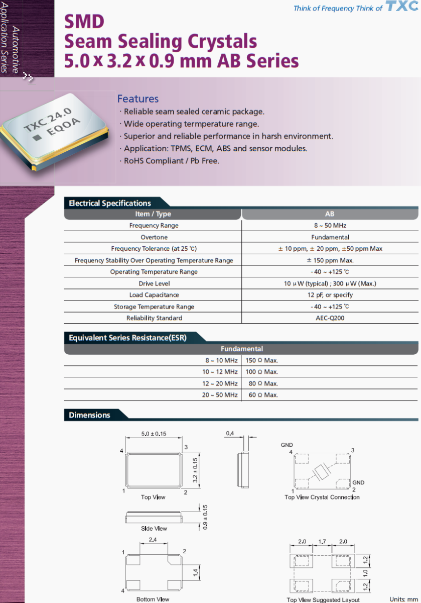 TXC臺產晶體,AB-12.000MALE-T四腳晶振,汽車胎壓檢測裝置晶振,AB系列SMD,縫封晶體,5.0* 3.2* 0.9 mm ,特點,可靠的縫封陶瓷封裝。工作溫度范圍寬。惡劣環境下性能優越可靠。應用范圍:TPMS, ECM, ABS,傳感器模塊。符合rohs標準/不含鉛臺灣TXC晶振公司,晶技晶振,無源晶振,5032晶振,AB-12.000MALE-T晶振,汽車晶振,汽車電動天窗控制系統晶振,臺灣晶振,貼片晶振,四腳晶振,石英晶振,高品質晶振,車載多媒體晶振,行車記錄儀晶振,低損耗晶振,耐高溫晶振,耐沖擊晶振。