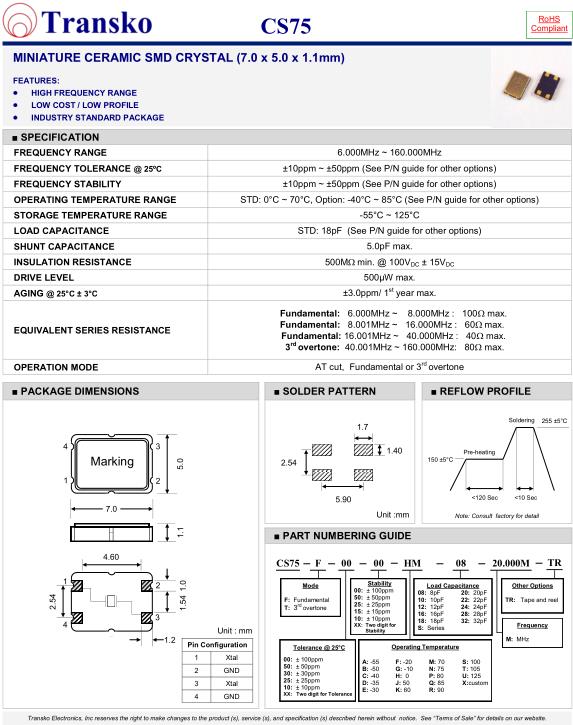 | SPECIFICATION-Transko晶振 | CS75晶振 |